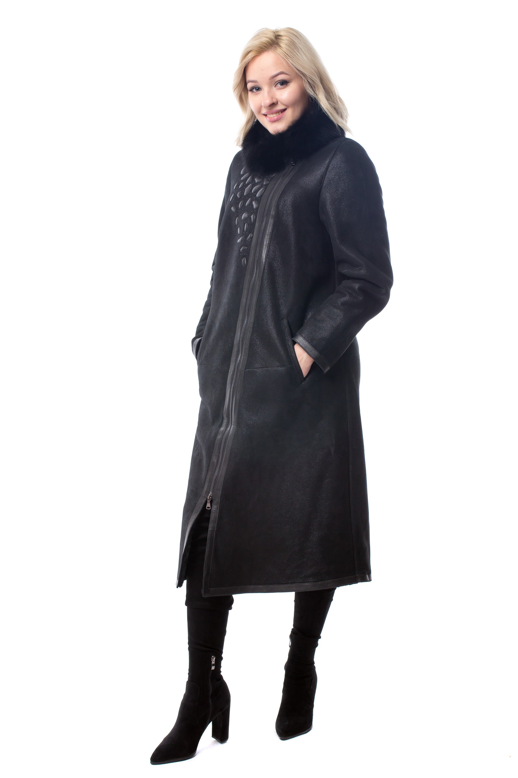 Пальто нагольное женское LINDI WEST 4096 натуральный мех-овчина,отделка- мех лисы крашенная